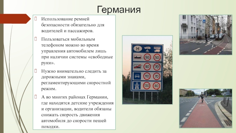 ГерманияИспользование ремней безопасности обязательно для водителей и пассажиров.Пользоваться мобильным телефоном можно во время управления автомобилем лишь при