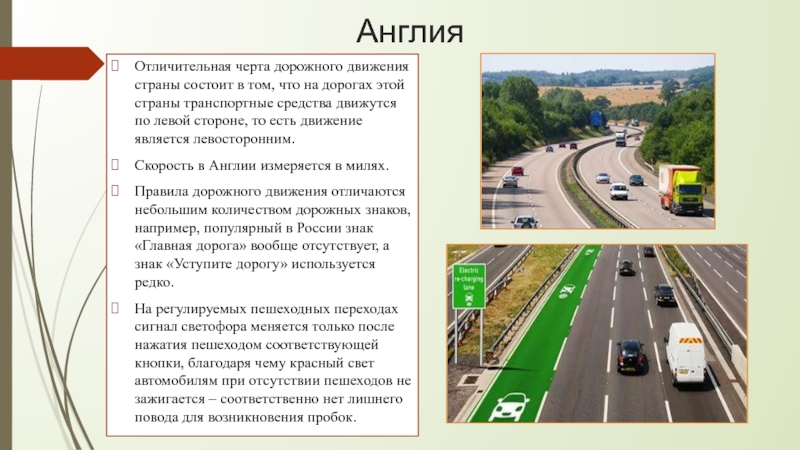 АнглияОтличительная черта дорожного движения страны состоит в том, что на дорогах этой страны транспортные средства движутся по левой стороне, то есть движение является левосторонним.Скорость в Англии измеряется в милях.Правила дорожного движения отличаются небольшим количеством дорожных знаков,