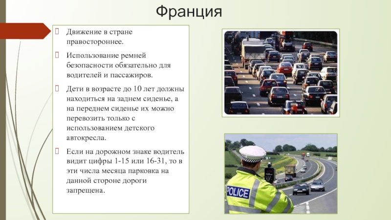 ФранцияДвижение в стране правостороннее.Использование ремней безопасности обязательно для водителей и пассажиров.Дети в возрасте до 10 лет должны