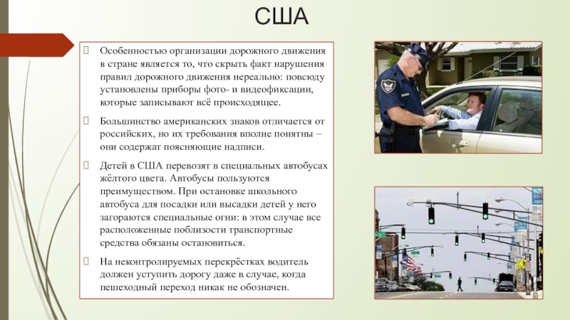 СШАОсобенностью организации дорожного движения в стране является то, что скрыть факт нарушения правил дорожного движения нереально: повсюду