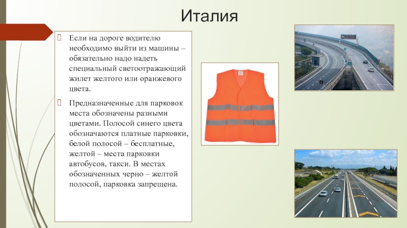 Италия Если на дороге водителю необходимо выйти из машины – обязательно надо надеть специальный светоотражающий жилет желтого