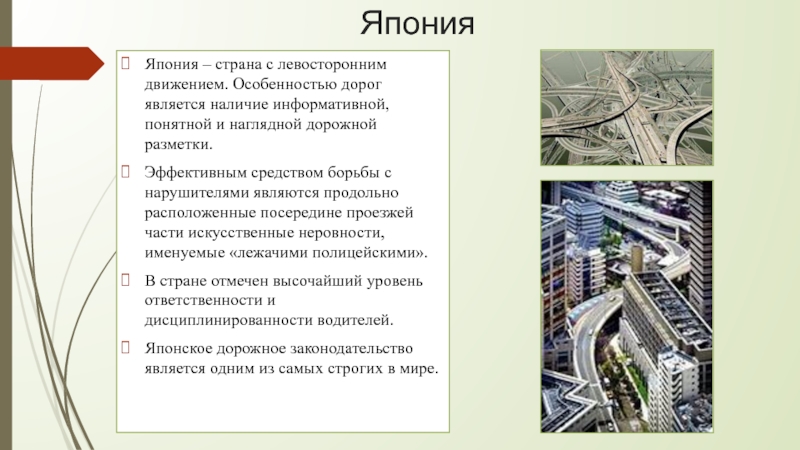 Япония Япония – страна с левосторонним движением. Особенностью дорог является наличие информативной, понятной и наглядной дорожной разметки.Эффективным