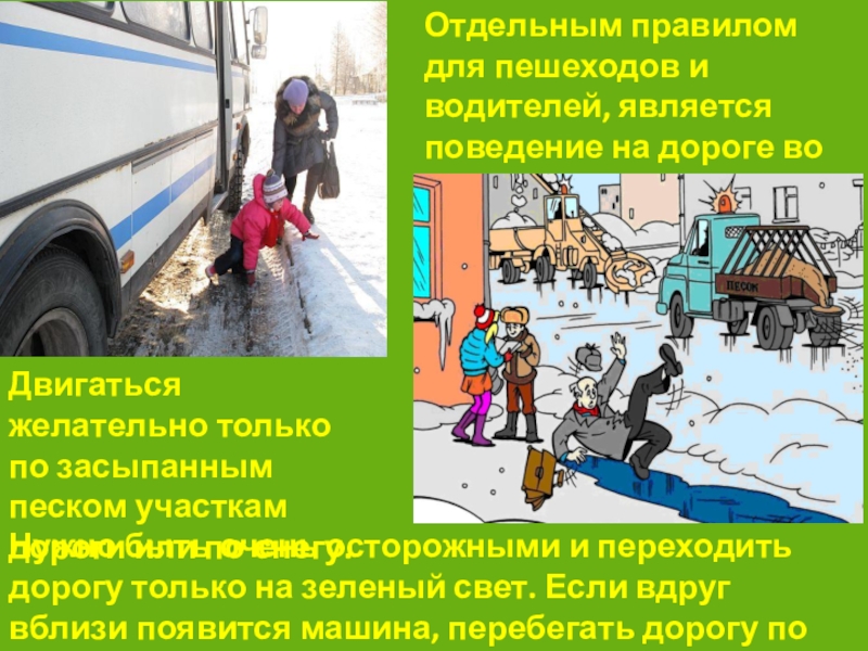Нужно быть очень осторожными и переходить дорогу только на зеленый свет. Если вдруг вблизи появится машина, перебегать дорогу по льду очень опасно.