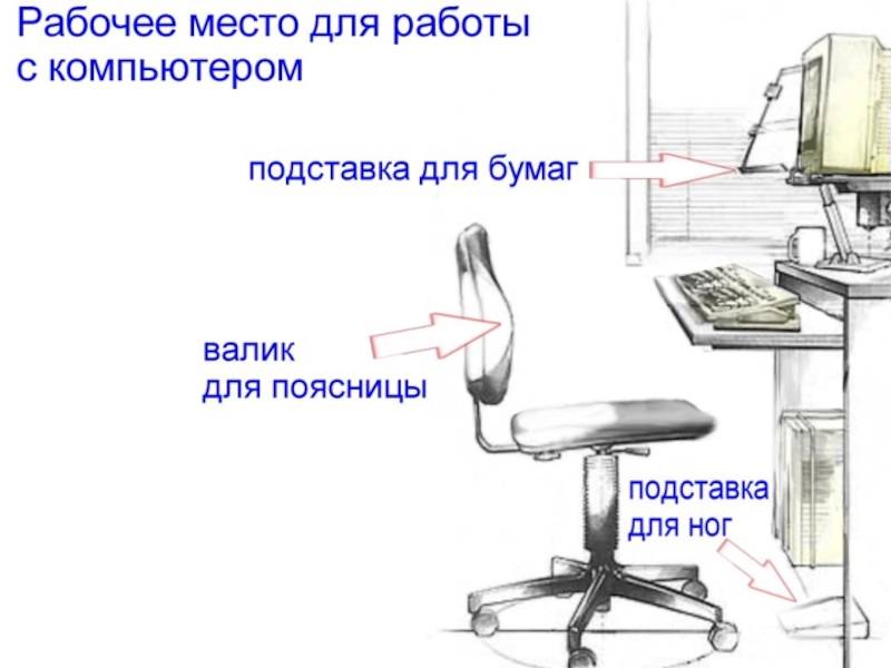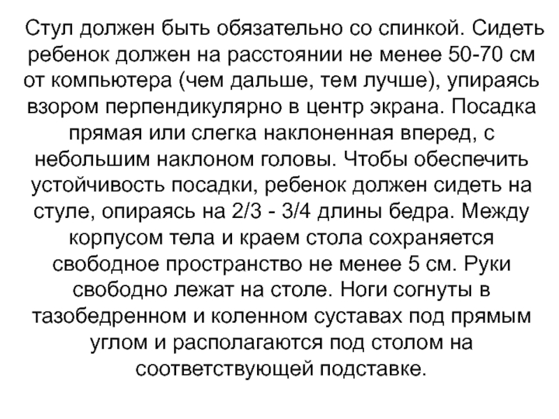 не менее 50-70 см от компьютера (чем дальше, тем лучше), упираясь взором перпендикулярно в центр экрана. Посадка прямая или слегка наклоненная вперед, с небольшим наклоном головы. Чтобы обеспечить устойчивость посадки, ребенок должен сидеть на стуле, опираясь на 2/3 - 3/4 длины бедра. Между корпусом тела и краем стола сохраняется свободное пространство не менее 5 см. Руки свободно лежат на столе. Ноги согнуты в тазобедренном и коленном суставах под прямым углом и располагаются под столом на соответствующей подставке.