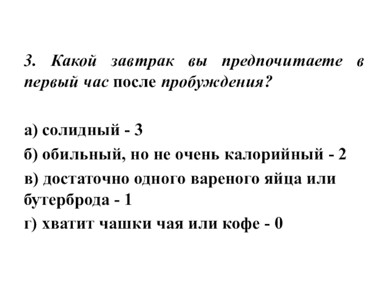 Слайд 103. Какой завтрак вы предпочитаете в первый час после пробуждения?