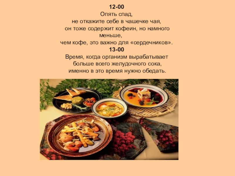 Период наибольшей активности желудка. Все, съеденное в это время, максимально усваивается. Позаботьтесь о том, чтобы это была полезная пища.