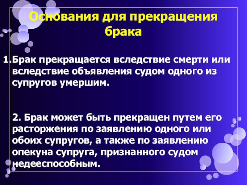2. Брак может быть прекращен путем его расторжения по заявлению одного или обоих супругов, а также по заявлению опекуна супруга, признанного судом недееспособным.
