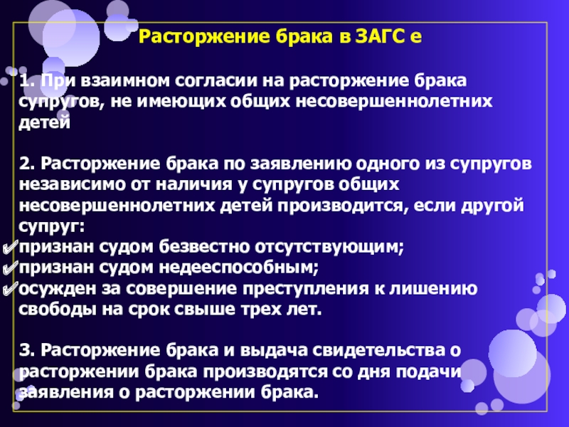 2. Расторжение брака производится в судебном порядке также в случаях, если один из супругов, несмотря на отсутствие у него возражений, уклоняется от расторжения брака в ЗАГСЕ (отказывается подать заявление, не желает явиться для государственной регистрации расторжения брака и другое).