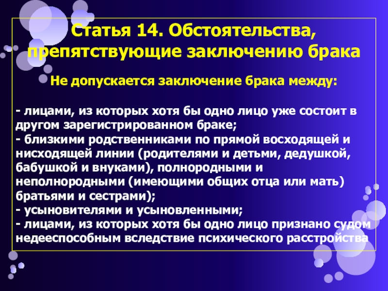 Слайд 7Статья 14. Обстоятельства, препятствующие заключению брака