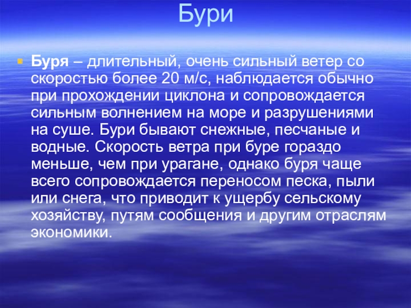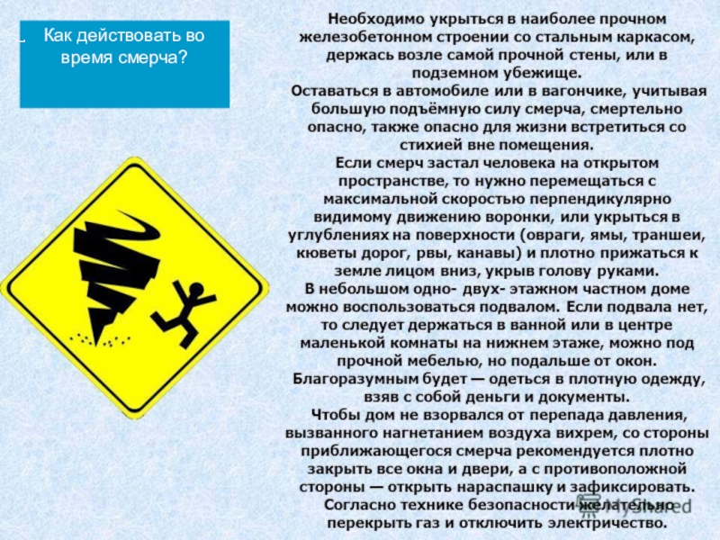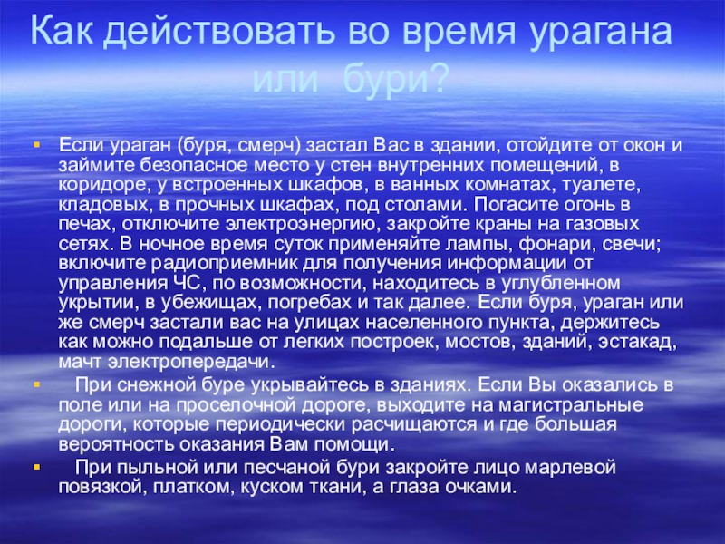 Вас в здании, отойдите от окон и займите безопасное место у стен внутренних помещений, в коридоре, у встроенных шкафов, в ванных комнатах, туалете, кладовых, в прочных шкафах, под столами. Погасите огонь в печах, отключите электроэнергию, закройте краны на газовых сетях. В ночное время суток применяйте лампы, фонари, свечи; включите радиоприемник для получения информации от управления ЧС, по возможности, находитесь в углубленном укрытии, в убежищах, погребах и так далее. Если буря, ураган или же смерч застали вас на улицах населенного пункта, держитесь как можно подальше от легких построек, мостов, зданий, эстакад, мачт электропередачи.
