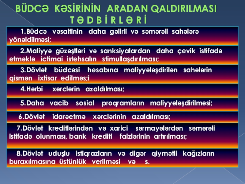 1.Müharibələrin, Təbii fəlakətlərlə əlaqədar xərclərin maliyyələşdirilməsi;