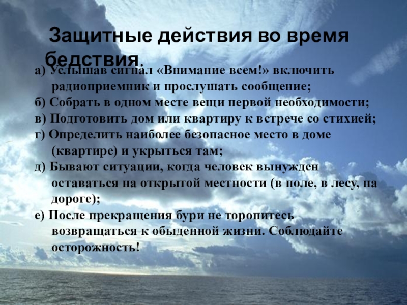 е) После прекращения бури не торопитесь возвращаться к обыденной жизни. Соблюдайте осторожность!