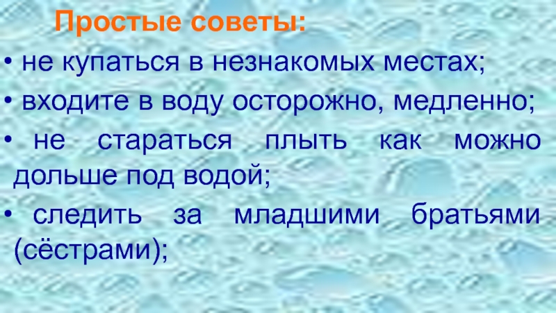 Простые советы: не купаться в незнакомых местах; входите в воду осторожно, медленно; не стараться