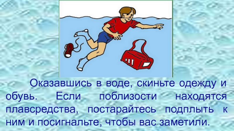Слайд 28 Оказавшись в воде, скиньте одежду и обувь. Если