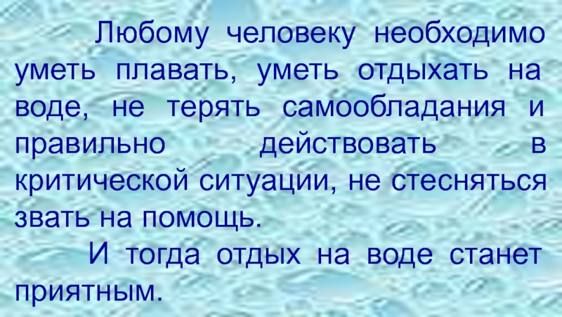 Любому человеку необходимо уметь плавать, уметь отдыхать на воде, не терять самообладания и правильно