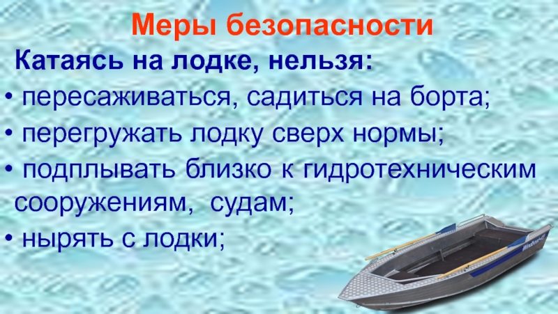 Меры безопасностиКатаясь на лодке, нельзя: пересаживаться, садиться на борта; перегружать лодку сверх нормы; подплывать близко к гидротехническим