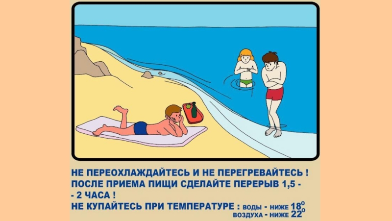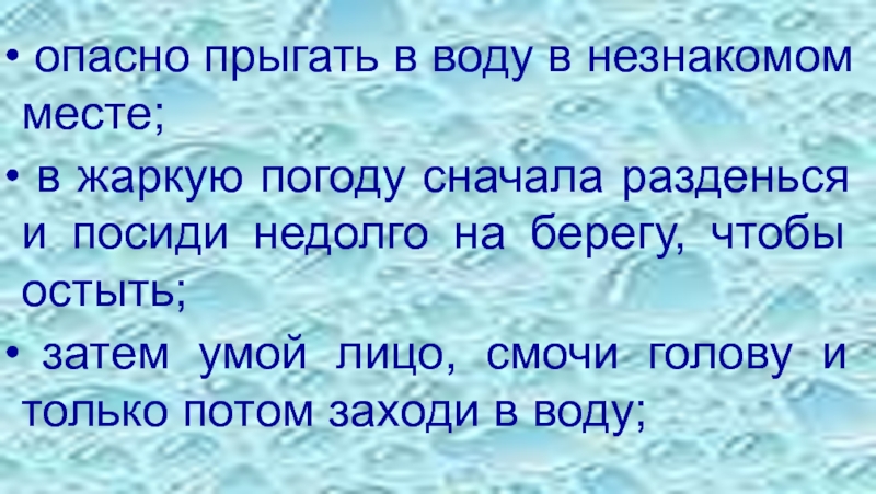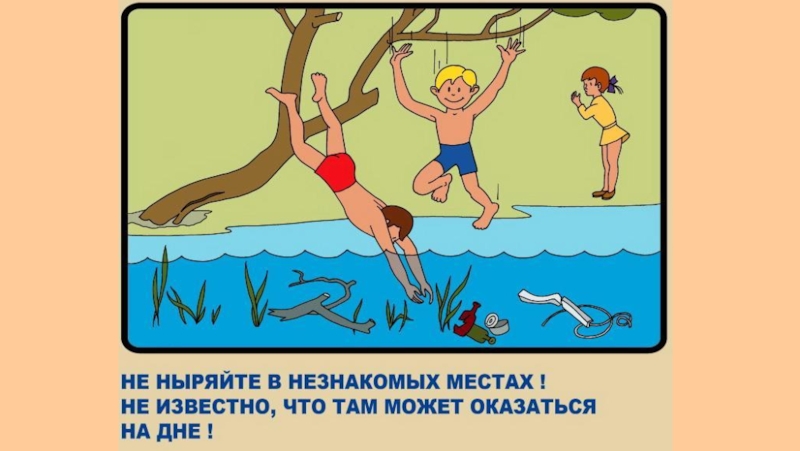 опасно прыгать в воду в незнакомом месте; в жаркую погоду сначала разденься и посиди недолго на