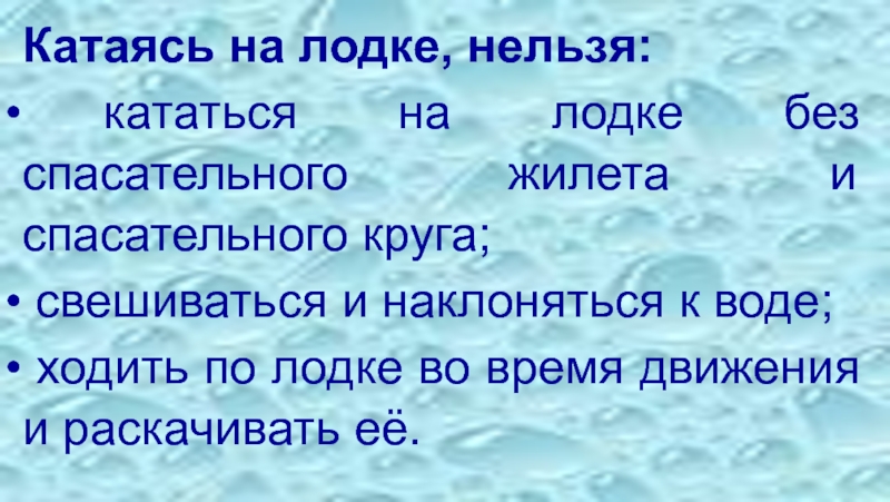Катаясь на лодке, нельзя: кататься на лодке без спасательного жилета и спасательного круга; свешиваться и наклоняться к