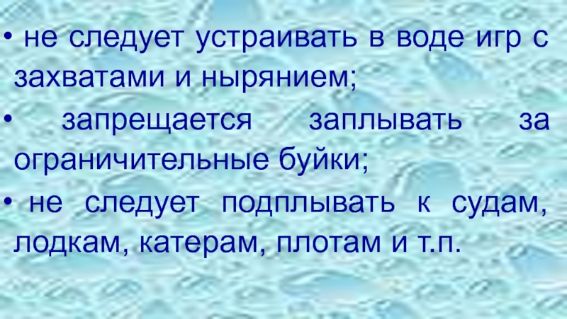 Слайд 8 не следует устраивать в воде игр с захватами и нырянием;