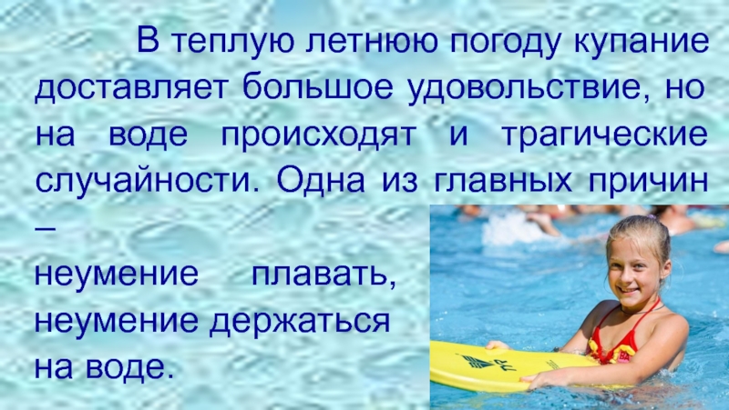 В теплую летнюю погоду купание доставляет большое удовольствие, но на воде происходят и трагические случайности. Одна из главных причин – неумение плавать, неумение держаться на