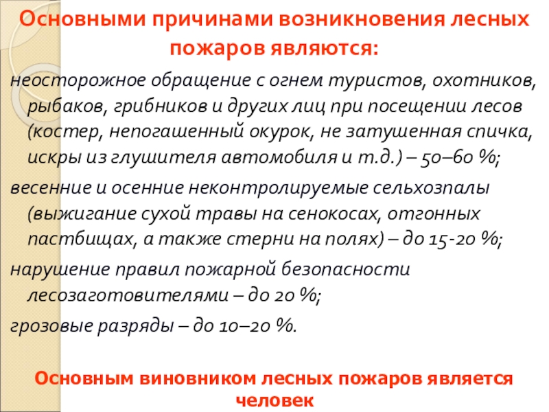охотников, рыбаков, грибников и других лиц при посещении лесов (костер, непогашенный окурок, не затушенная спичка, искры из глушителя автомобиля и т.д.) – 50–60 %;