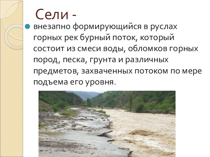 состоит из смеси воды, обломков горных пород, песка, грунта и различных предметов, захваченных потоком по мере подъема его уровня.