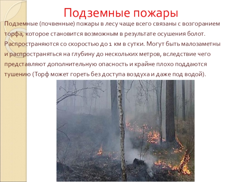 Подземные (почвенные) пожары в лесу чаще всего связаны с возгоранием