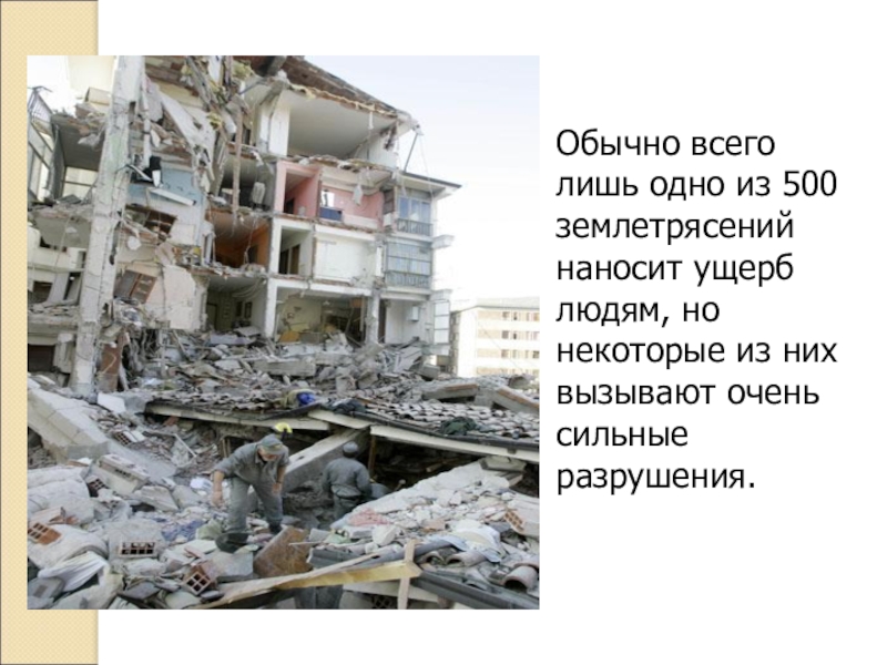 Слайд 8Обычно всего лишь одно из 500 землетрясений наносит ущерб людям, но
