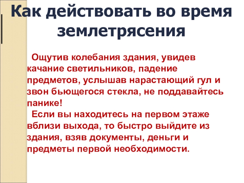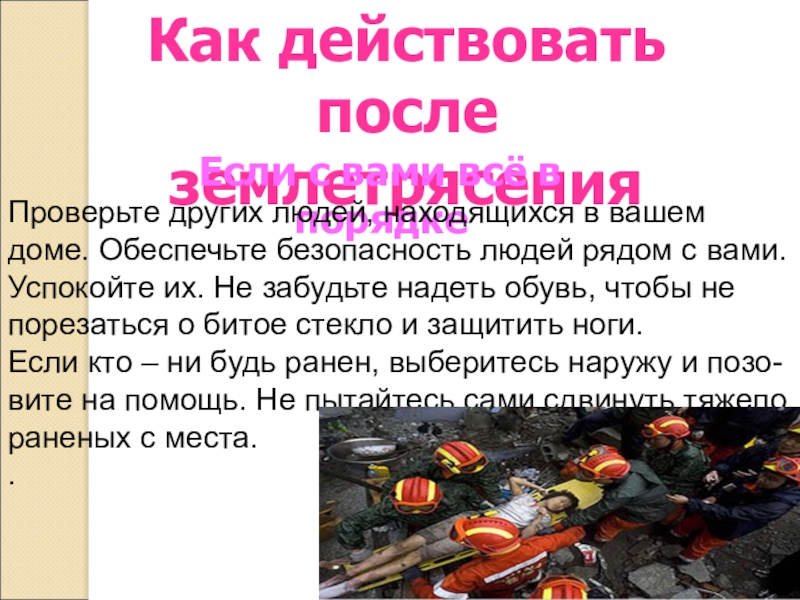 в вашем доме. Обеспечьте безопасность людей рядом с вами. Успокойте их. Не забудьте надеть обувь, чтобы не