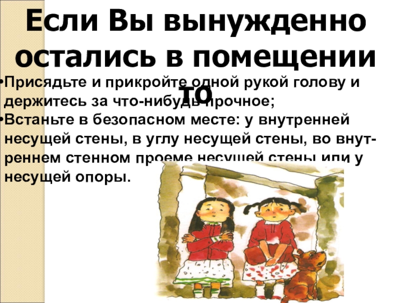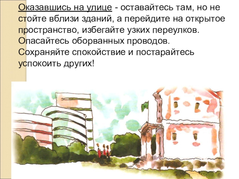 Слайд 10Оказавшись на улице - оставайтесь там, но не стойте вблизи зданий,
