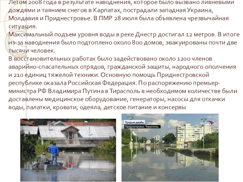 и таянием снегов в Карпатах, пострадали западная Украина, Молдавия и Приднестровье. В ПМР 28 июля была объявлена чрезвычайная ситуация.
