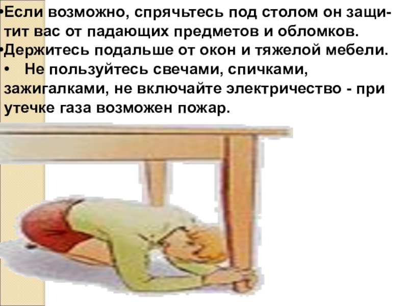 Слайд 12Если возможно, спрячьтесь под столом он защи-