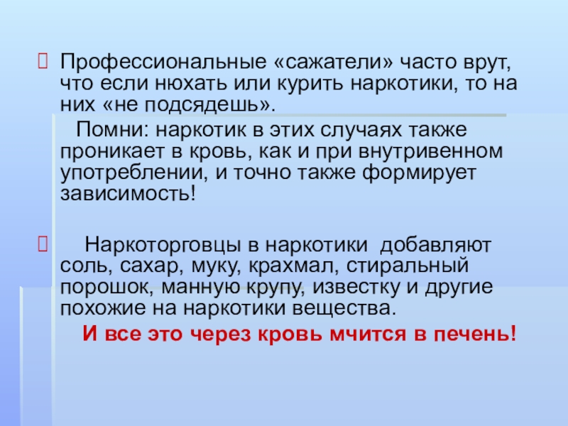Помни: наркотик в этих случаях также проникает в кровь, как и при внутривенном употреблении, и точно также формирует зависимость!