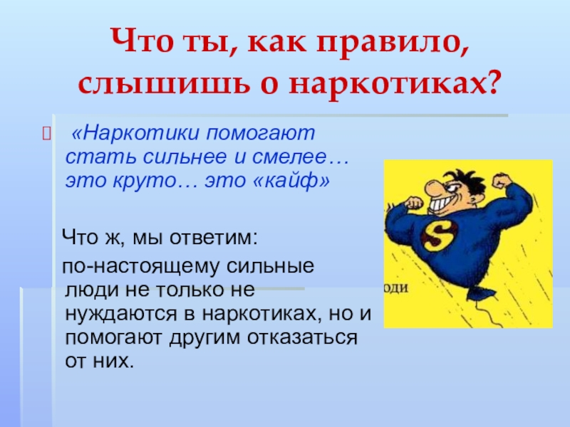 Слайд 2Что ты, как правило, слышишь о наркотиках?