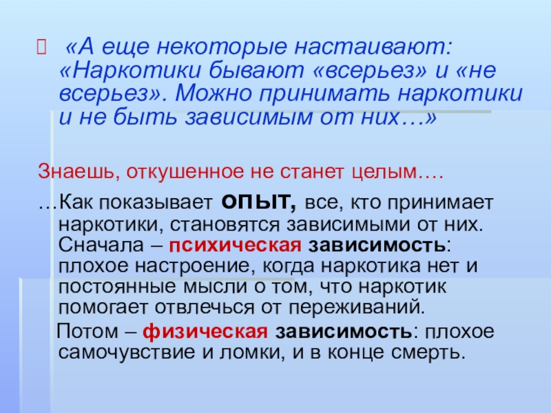 …Как показывает опыт, все, кто принимает наркотики, становятся зависимыми от них. Сначала – психическая зависимость: плохое настроение, когда наркотика нет и постоянные мысли о том, что наркотик помогает отвлечься от переживаний.