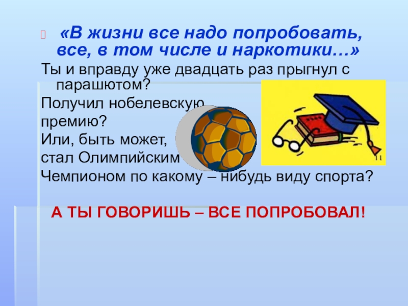 Слайд 5 «А еще некоторые настаивают: «Наркотики бывают «всерьез» и «не всерьез».