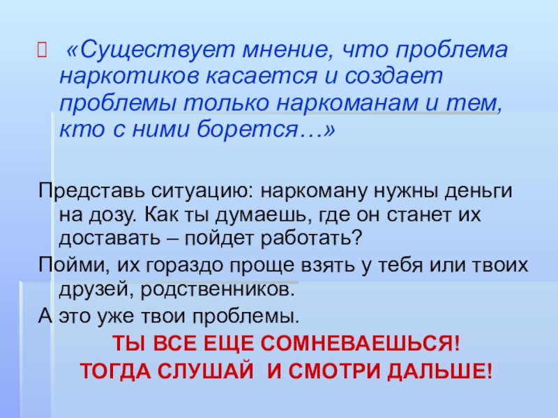 Слайд 7 «Существует мнение, что проблема наркотиков касается и создает проблемы только