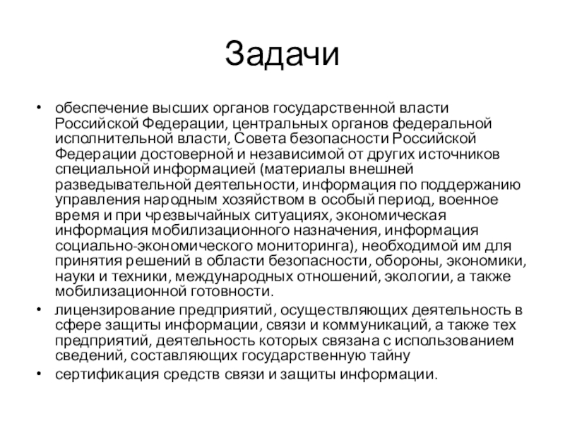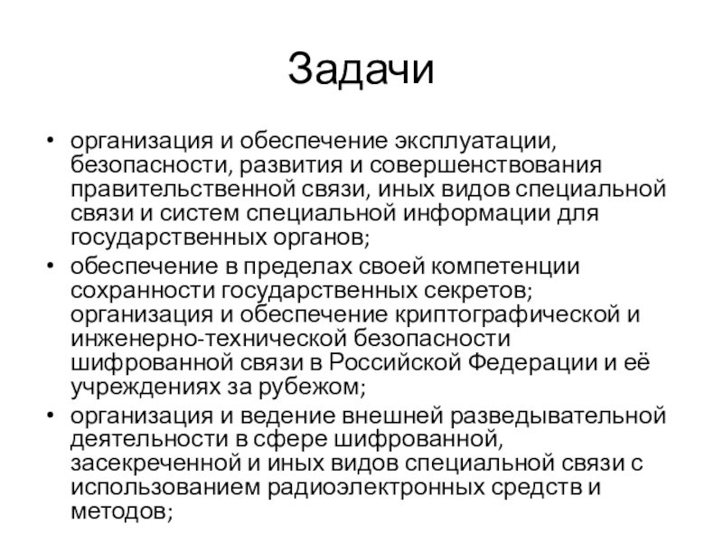 обеспечение в пределах своей компетенции сохранности государственных секретов; организация и обеспечение криптографической и инженерно-технической безопасности шифрованной связи в Российской Федерации и её учреждениях за рубежом;