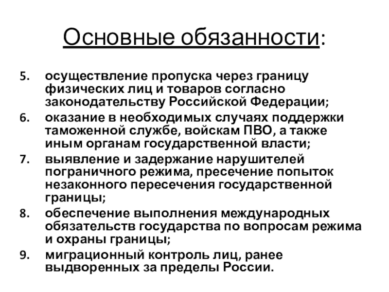 осуществление пропуска через границу физических лиц и товаров согласно законодательству