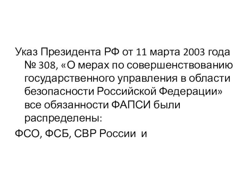по совершенствованию государственного управления в области безопасности Российской Федерации» все обязанности ФАПСИ были распределены: