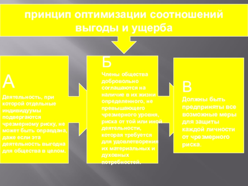 Члены общества добровольно соглашаются на наличие в их жизни определенного, не превышающего чрезмерного уровня, риска от той или иной деятельности, которая требуется для удовлетворения их материальных и духовных потребностей.