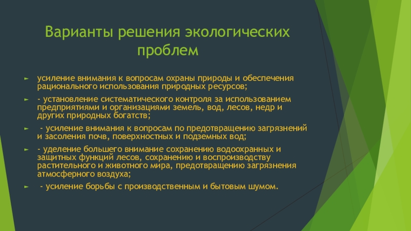 Варианты решения экологических проблемусиление внимания к вопросам охраны природы и обеспечения рационального использования природных ресурсов; - установление
