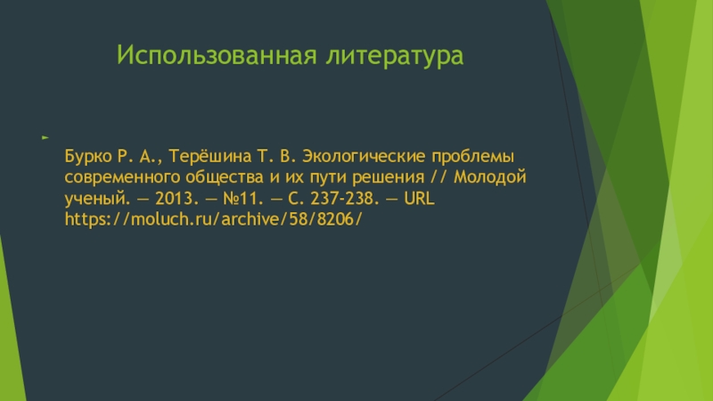 Использованная литература Бурко Р. А., Терёшина Т. В. Экологические проблемы современного общества и их пути решения //
