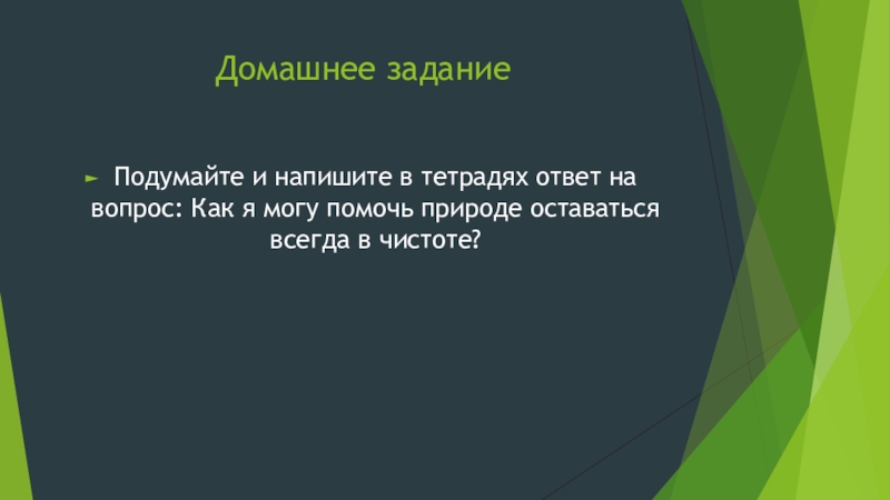 Домашнее заданиеПодумайте и напишите в тетрадях ответ на вопрос: Как я могу помочь природе оставаться всегда в