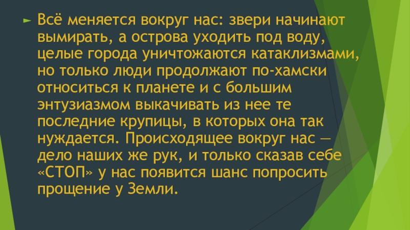 воду, целые города уничтожаются катаклизмами, но только люди продолжают по-хамски относиться к планете и с большим энтузиазмом выкачивать из нее те последние крупицы, в которых она так нуждается. Происходящее вокруг нас — дело наших же рук, и только сказав себе «СТОП» у нас появится шанс попросить прощение у Земли.