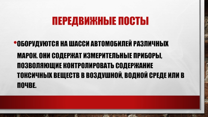 Передвижные постыоборудуются на шасси автомобилей раз­личных марок. Они содержат измерительные приборы, позволяю­щие контролировать содержание токсичных веществ в