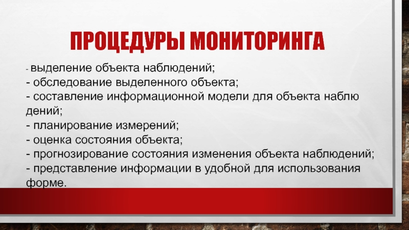 Процедуры мониторинга- выделение объекта наблюдений;- обследование выделенного объекта;- составление информационной модели для объекта наблю­дений;- планирование измерений;- оценка