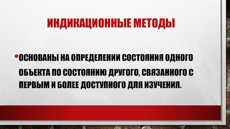 Индикационные методыоснованы на определении состоя­ния одного объекта по состоянию другого, связанного с первым и более доступного для