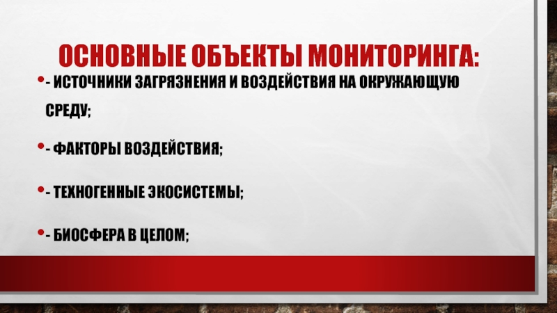 основные объекты мони­торинга:- источники загрязнения и воздействия на окружающую среду;- факторы воздействия;- техногенные экосистемы;- биосфера в целом;