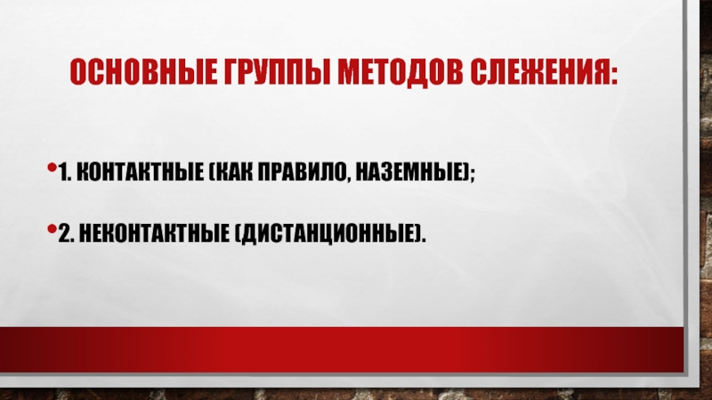 основные группы методов слежения:1. Контактные (как правило, наземные);2. Неконтактные (дистанционные).